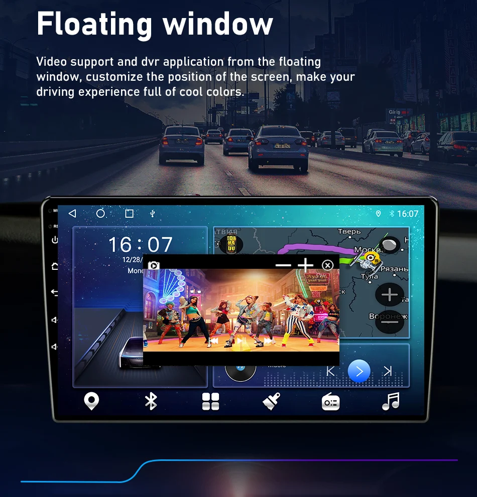 Support video and DVR application Of Floating Window, customize the display position, and make your driving experience full of cool colors.