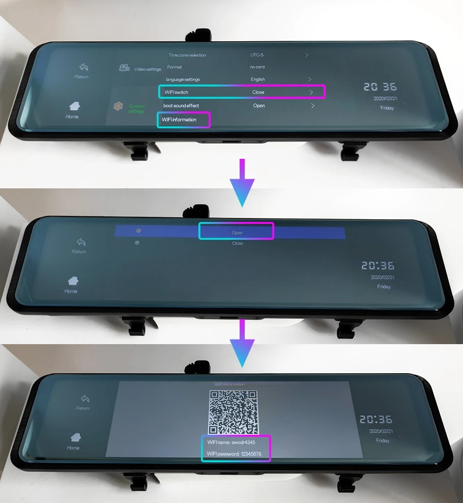 4. Connect the mobile phone to the WIFI account and password displayed on the mirror screen to connect to the APP