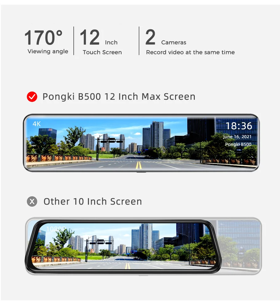 Cheap Price 12 Inch Full Screen Pongki Rearview Dash Cam Wide 2160p Auto Cam B500 Rear View Mirror Car Recorder Stream Media Car DVR Cam with FREE Worldwide Shipping!