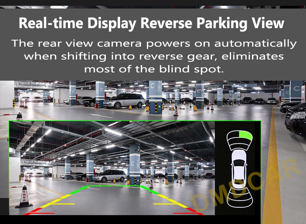 >>> support car factory 360 camera/aftermarket camera and factory parking sensors, the screen will automatically switch to parking image when reversing gear engaged.
