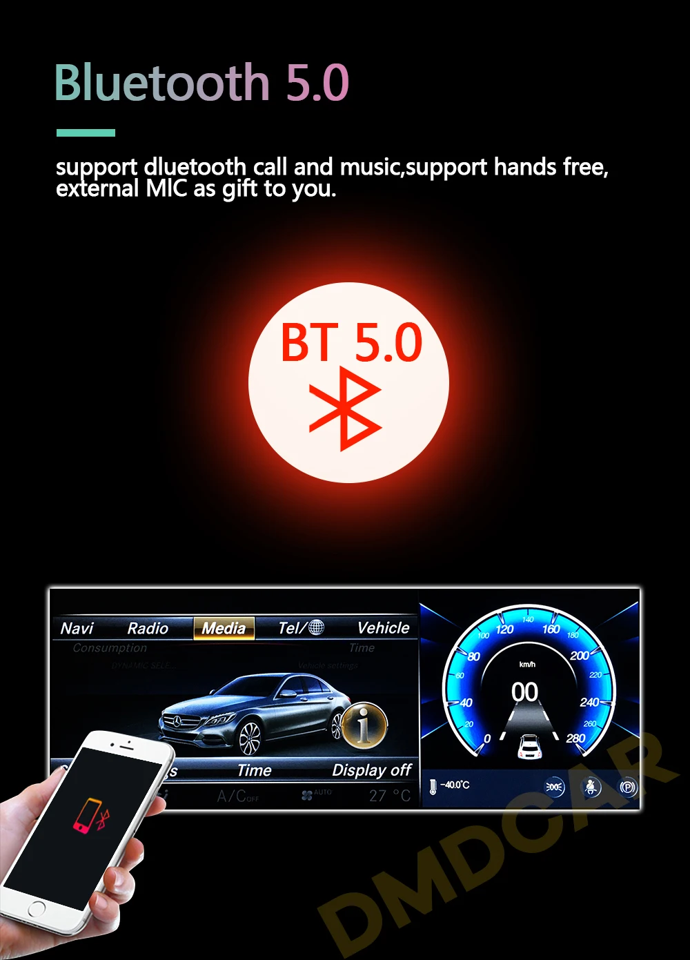 Bluetooth 5.0 support dluetooth call and music,support hands free.external MIC as gift to you.