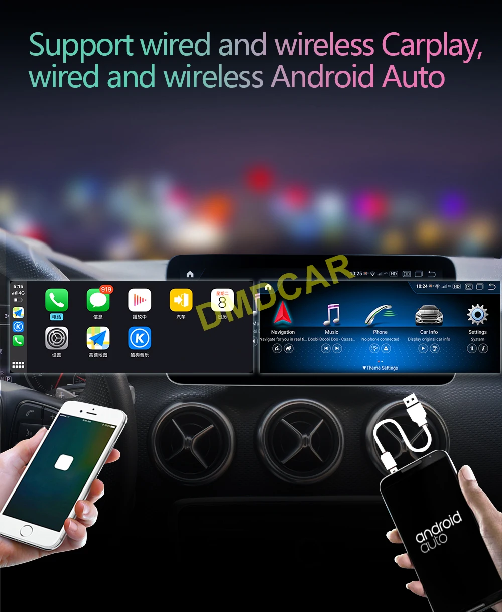 Support wired and wireless Carplay,wired and wireless Android Auto.