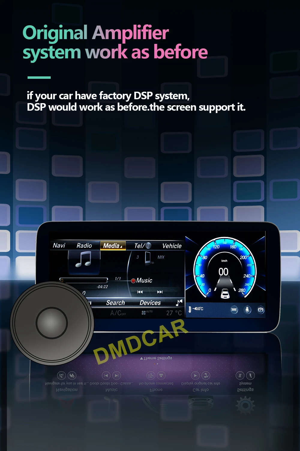 Original Amplifier.system work as before.if your car have factory DSP system,DSP would work as before.the screen support it.