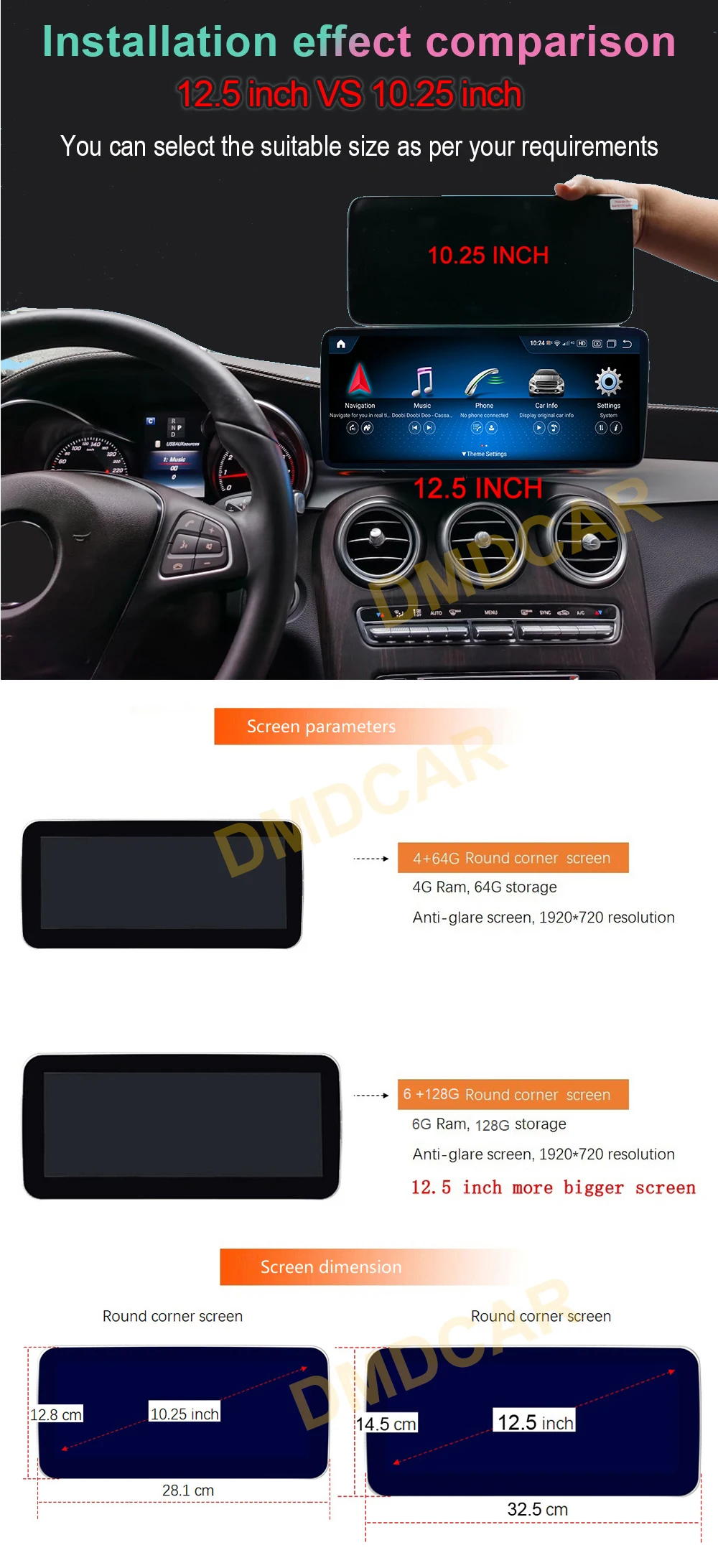 - 12.5" premium IPS 5-point touch screen, clear display at ultra-wide viewing range, HD 1920*720 resolution.