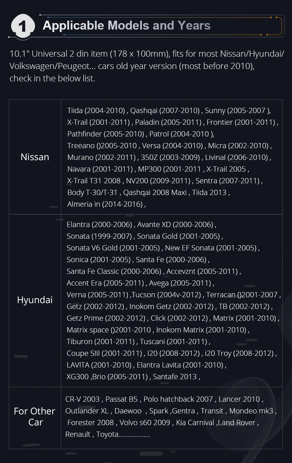 Attention: the above information for your reference only, sometimes it may not be compatiable with some cars because that the cars are made in different countries in different year version, thank you for your understanding.