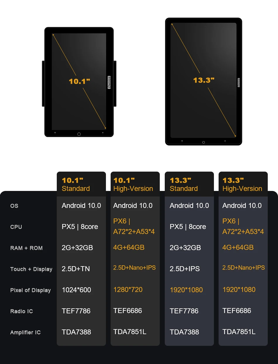 13.3 Inch K3-PX6 : Android 10.0 | PX6 | 2xCortex-A72 + 4xCortex-A53| 4G+64GB | 2.5D+Nano+IPS | 1920*1080 | Radio TEF6686 | Amplifier TDA7851L