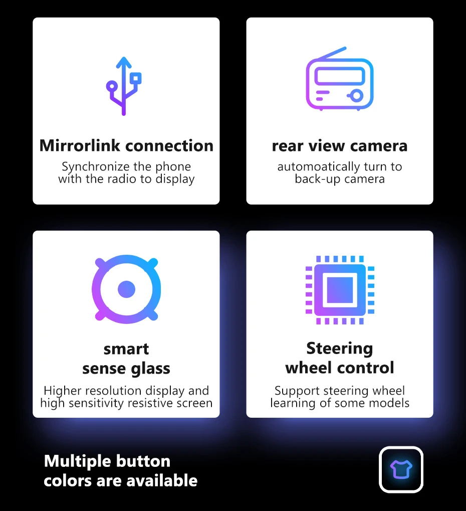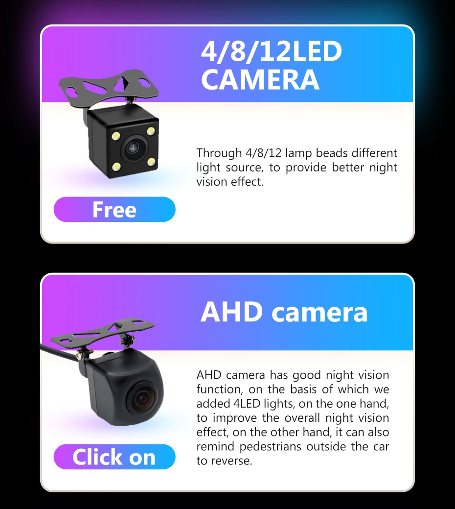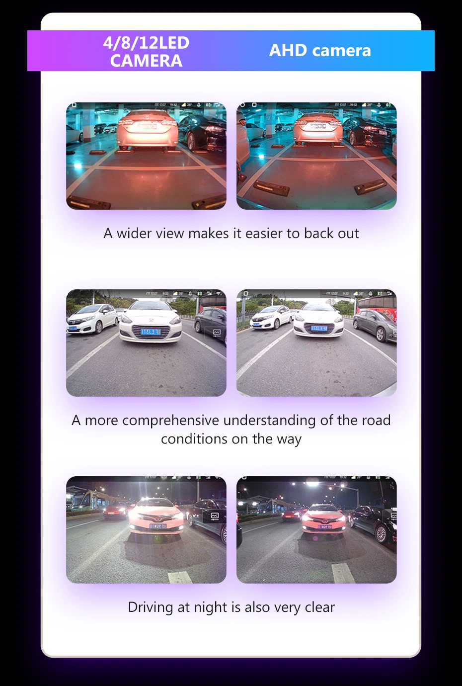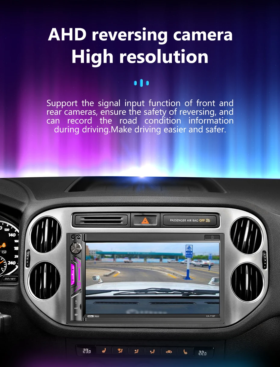 Support rear/front view camera,easy installation and operation.this input automatically powers the rear camera when the vehicle shifts into reverse and displays the image on the unit's screen,it could work as a parking assistance.