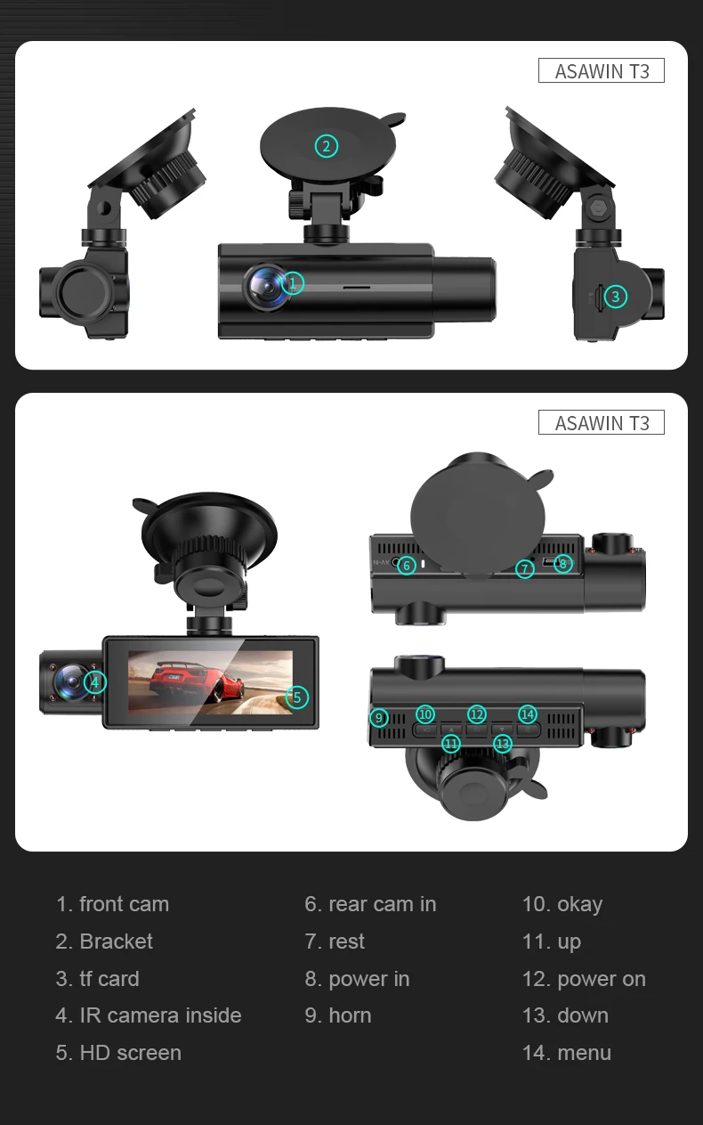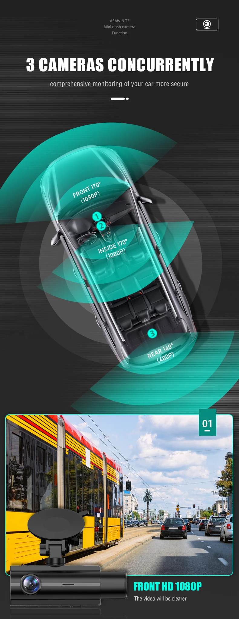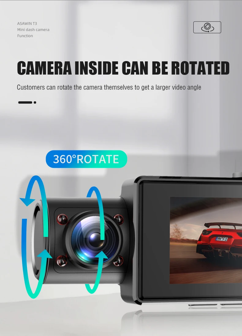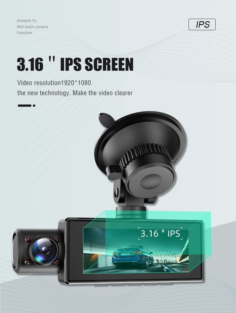 3 Ways Dash Cam for Car DVR 1080P Camera 3 Lens Night Vision 3.16 Inch Ips Screen G-sensor Reversing Image