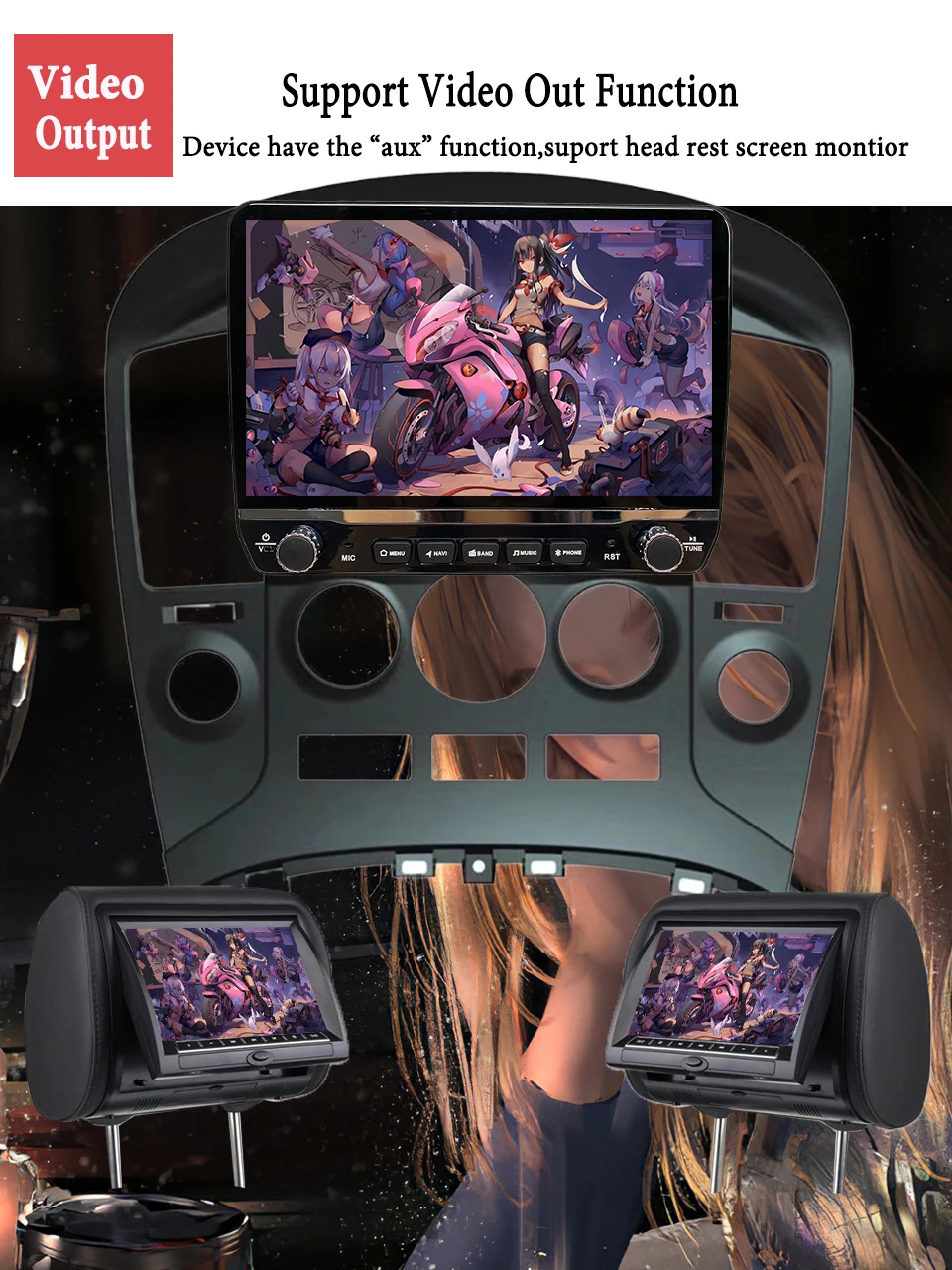Audio and the video out put connector,you can use it connect with your headrest or the other screen ,you can share with your friend or family with good memory.