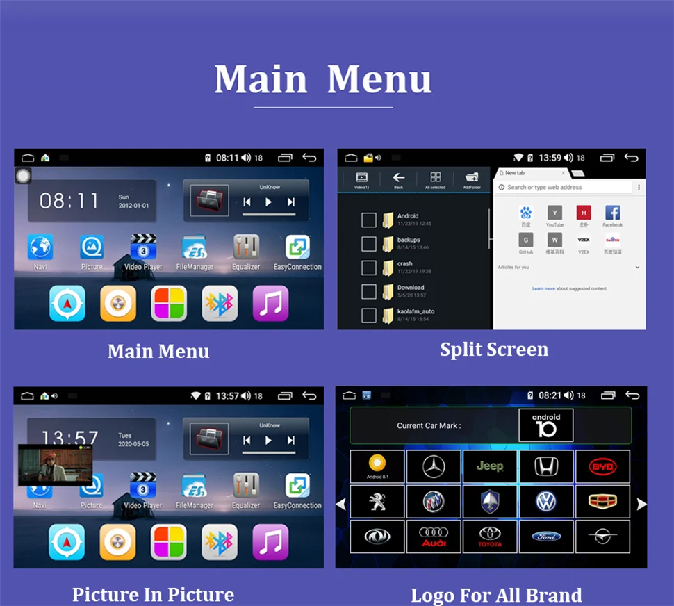 1024*600 screen resolution, support HD 1080P video display. Build-in wifi to enjoy online music and videos. Support display by USB and SD Card. Support Media Format:JPEG,DVD-R/RW,CD,WMA,Mp3,DVD-RAM,Mp4,ect.
