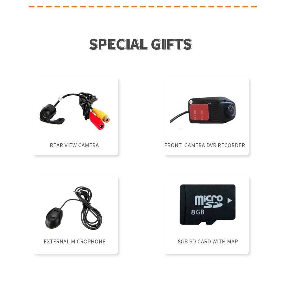 5.Support1080P+Support Lossless music 6.Support Steering Wheel Control(If your car have it) 7.Bluetooth Phonebook Search From "A to Z" 8.5"Capacitive Multi-touch screen 9.WifiBuilt-in, Do not need connect external Wifi Dongle,Can get WLAN 10.8GBMap Card As Gift(IfWe do not have the country that you need, would send Empty SD Card as gift) 11. Built in MIC 12. OSDLanguage: English/Russian/ French/ German/ Spanish/ Italian/ Arabic/ Portuguese/Turkish/Thai/Polish/Hebrew etc over 20 kinds language 13.Rear View Camera and front view dvr camera Include .no need to buy extra 14. Support Media Card/GPS Card/ USB Stick up to256GB SD card and 1T hard disk 15.DIY Main Menu Display: You can drag Search Bar, Weather Forecast widgets, Music/Radio/BT-Stereo Player,Apps or other Bookmarks on main menu to display 16. Built-In Clock and Calendar, it has a Real Clock to show time, Clock/Date/Week adjustable 17. Choose76 open unit logosand Radio Area in Factory Settings 18.8 live wallpapers,21wallpapers, supportDIYwallpaper from Gallery Pictures 19.Built-inWiFi dongle, support 802.11b/g/n WLAN Standard, High Performance, Low Power Consumption 20.Support3GInternet, support extral USB Dongle: WCDMA,EVDO,TD-SCDMA. 21 SupportGoogle Maps online Navigating, you can use GPS Navigating if you in Internet 22 SupportAndroid Maps Navigation, Free 8GB TF Card with maps will be in parcel contents included 23 SupportDual Zonefunction, while Navigating you can listen music or radio at the same time 24 SupportAndroid Multimedia Player, it can play Music/Movie/Photo from local Disc or connected TF Card. 25Online Entertainment, support online video, TV, movie, music, radio, Youtube, Yahoo, MSN... 26Online Communication, keep connected through WeChat, Twitter, Facebook, Gtalk, Gmail and other services 27. Support read and editOfficial Software, WORD/EXCEL/POWERPOINT/PDF/TXT. 28. SupportGoogle Play Store, you can download thousands of Apps from here and you can down many popular games like Fruit Ninja, Feed the Candy, Angry Birds, Fieldrunner, speed forge 3D... 29. Support3D Games, HD Video, 1080P, H.264, DIVX Live imagesFormats 30. Support HD Videos up to1920*1080pixels, Photo up to 4096*4096 pixels 31. 4 x 45w Surround Stereo,SubwooferOutput 32. SupportBluetooth hands-freefunction, built-in microphone 33. SupportA2DP Bluetooth, can play stereo music through Bluetooth from your Phone 34.Download phone bookfunction, you can download contact information from your phone to this unit 35. Support the newestPhone Book Search, you can search&find a contact member in downloaded phone book,just input the first letter of name, you will find some associated names, then you can choose the right one 36.RadioTuner withRDS, 30 Preset Radio Stations (FM: 3*6, AM: 2*6) 37.USBPort and MicroSDSlot, Support USB Stick and Memory Card up to 32GB 38.Built-inCar DVR System, just connect with a USB Camera to use Car Record function. the records will be saved in GPS card automatically, and you can play saved record on this unit directly. 39. Support ExternalMPEG2/MPEG4/ISDB-T Box input T2, Touch Control and Power supply(Optional) 40. SupportRear View Camerainput and reverse trig