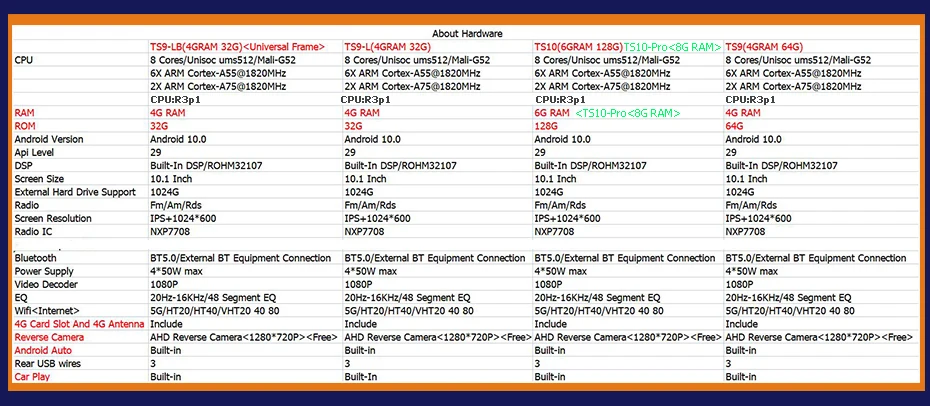 >>TS10-Pro(8GRAM 128G)=8 Cores Processors( 6X ARM Cortex-A55@1820MHz+2X ARM Cortex-A75@1820MHz)+8G RAM+128G ROM+DSP*48EQ+Support Install 4G SIM Card+Wifi+AHD Reverse Camera Gift+Built-In Carplay+Built-In Android Auto+Customized Picture Start Logo/