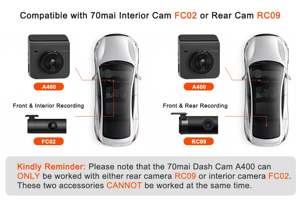 2. For 70mai Interior Dash Cam FC02 and 70mai Rear Cam RC06/RC09, cannot be used at the same time.Because there is only one port on the A500S/A800S/A400.