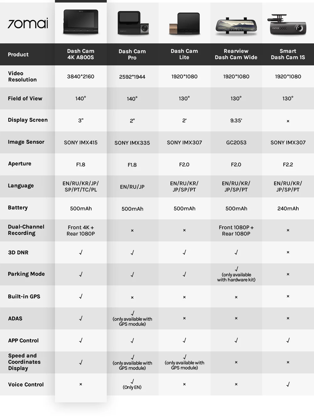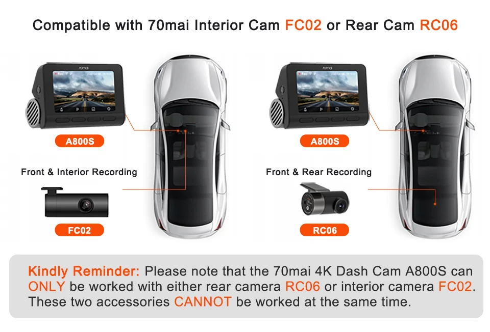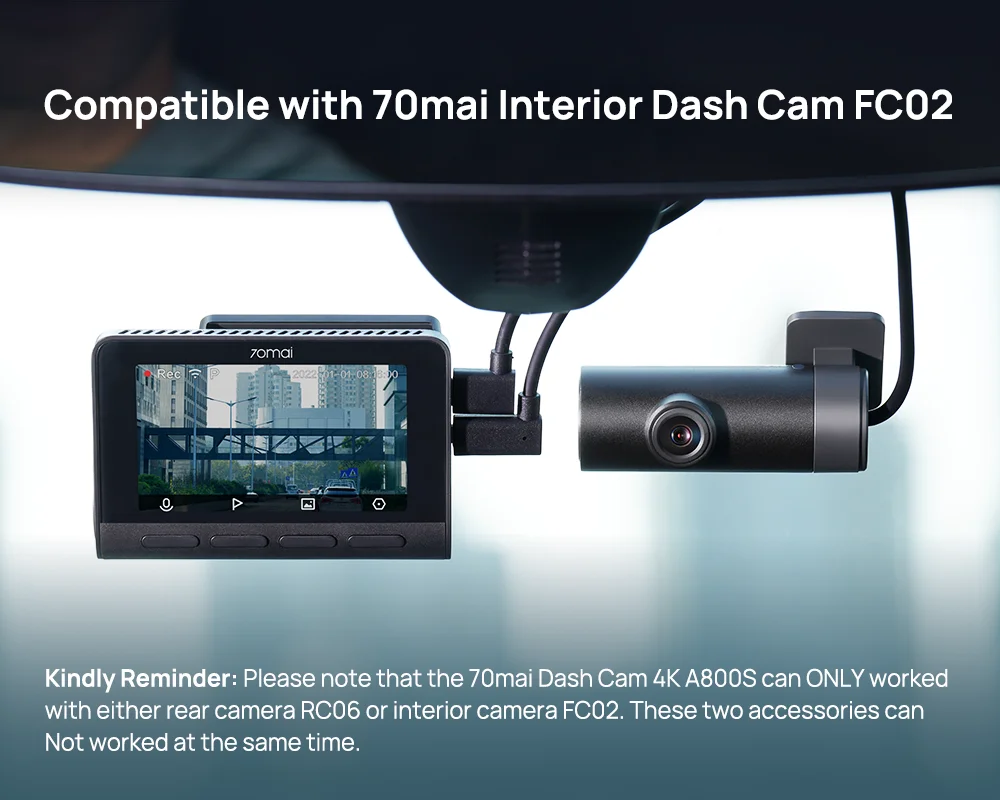 2. For 70mai Interior Dash Cam FC02 and 70mai Rear Cam RC06/RC09, cannot be used at the same time.Because there is only one port on the A500S/A800S/A400.