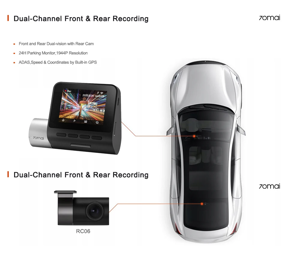 Compatible with the RC06 rear camera, the Pro Plus+ can achieve dual-channel recording, providing all-round protection so you can drive with peace of mind.In dual-channel mode, the front camera maintains up to 1944P resolution, the rear camera records in 1080P.