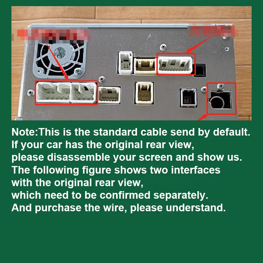 Note: This is the standard cable that we send by default. If your car has the original rear view, please disassemble your screen and show us the interface. The following figure shows two interfaces with the original rear view, which need to be confirmed separately. And purchase the wire, please understand.