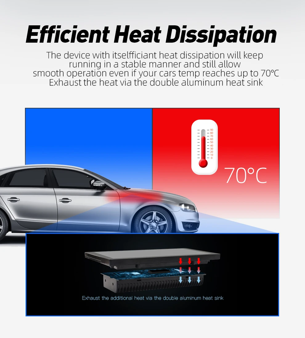 13.Efficient Heat Dissipation.The device with itselfficiant heat dissipation will keep running in a stable manner and still allow smooth operation even if your cars temp reaches up to 70℃.Exhaust the heat via the double aluminum heat sink