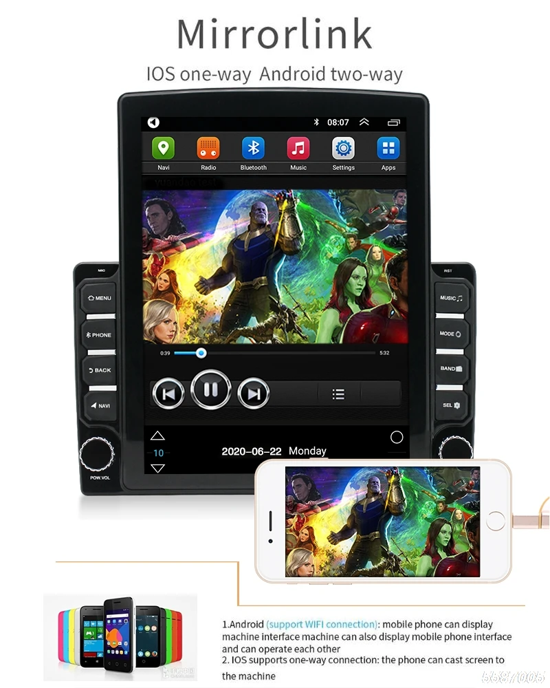Built-in Mirror link. It can connect with Iphone via Wifi hotspots and connect with Android mobile phone via USB data cable and Wifi Hotspot. The mobile phone image will display on DVD, also music, video, game. For Android mobile, the DVD touch screen can control the mobile.(Please note: It can support a part of Android mobile not all of them)