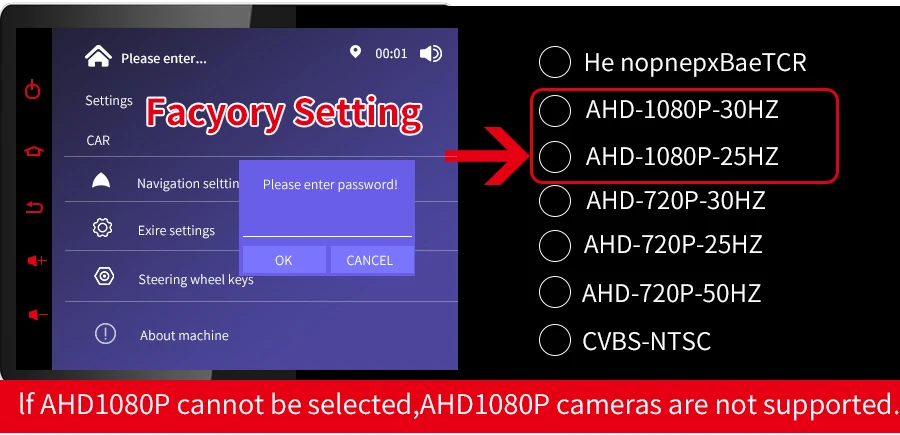 Go to Car settings >> Factory settings >> Reverse (picture) settings >> Select AHD1080P