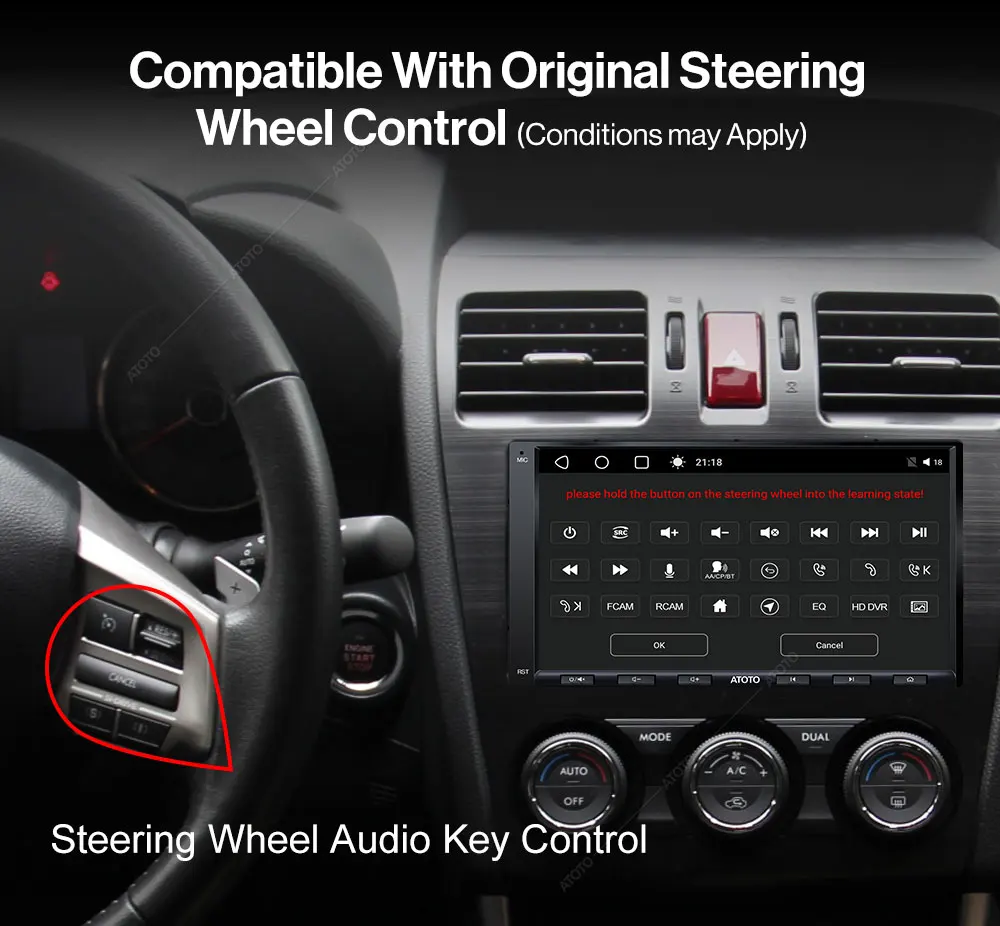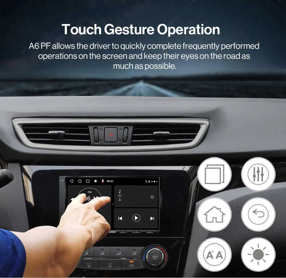 It also has six touch gestures that support a 2-finger/3-finger tap on the screen to enter the multi-task menu, or switch EQ modes, making operation easier during driving. With a split-screen display, you can run two apps (like Youtube and Map) on the same screen. NOTE: For A6 PF, the wireless steer wheel control interface is not available; hence, the ATOTO AE-AC-44F5-X steering wheel IR remote is not applicable.