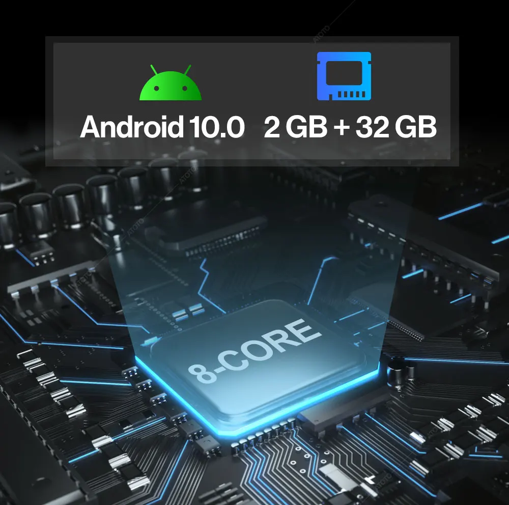 8 Core ARM Cortext A55 / 2 GB + 32 GB / Android 10.0 / Work with wired Apple CarPlay, Android Auto, and Mirror Link (EasyConnection App) / 3 Internet Accesses - Hotspot, Bluetooth and USB network thethering / BT hands-free & audio streaming / Bluetooth screen lock feature / 2 USB ports (one for Phone Link and one for external storage- read up to max. 2TB SSD) / HD rear-view camera input / Live rear-view (LRV) feature / 178° full-viewing angle capacitive touch screen / Touch gesture control / Physical buttons.