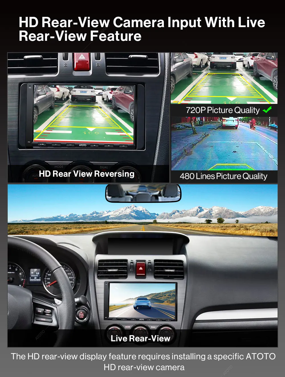 HD rear-view camera input / Live rear-view (LRV) feature / 178° full-viewing angle capacitive touch screen / Touch gesture control