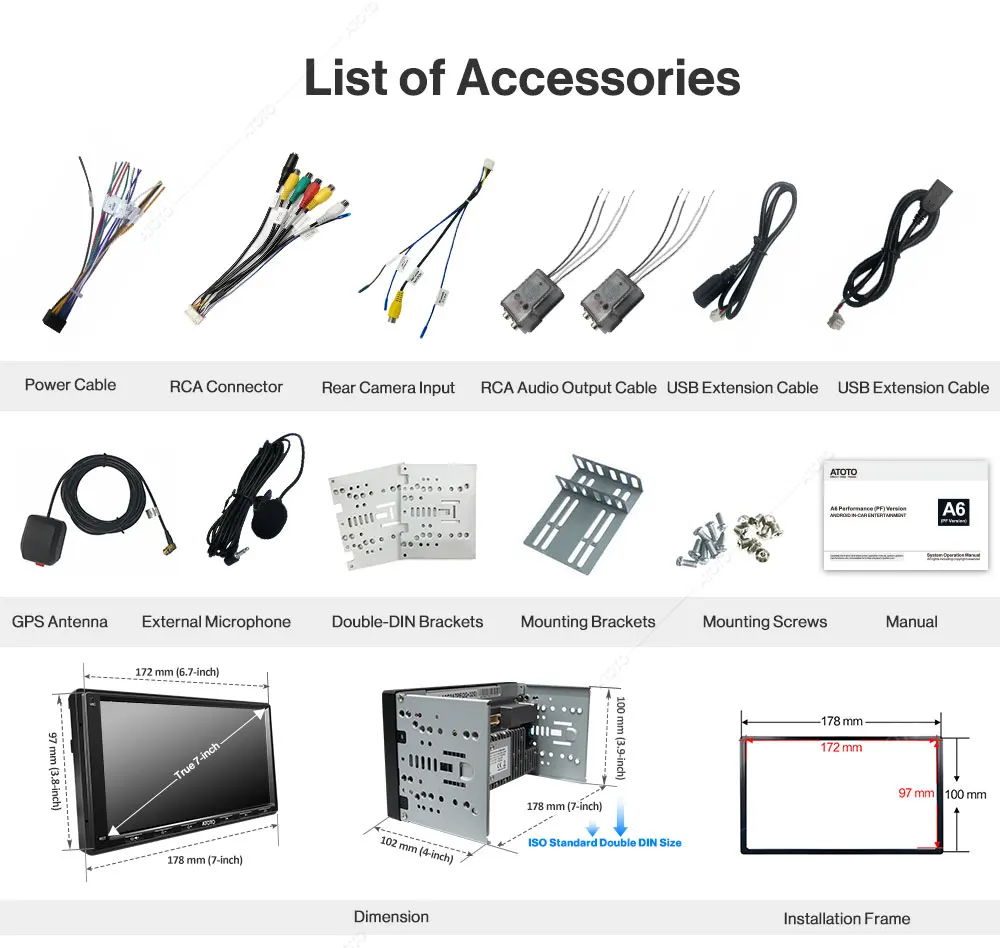 Most dashboard mounting frame suppliers from North America may provide a double-DIN mounting frame with 172mm*97mm opening (Metra dash kit, PAC dash kit, etc.). ATOTO is the first to bring an Android 7-inch car stereo with a minimum of 172mm*97mm front panel dimension. An extra frame adapter is also included in the package to extend its size to 178mm * 101.5mm;