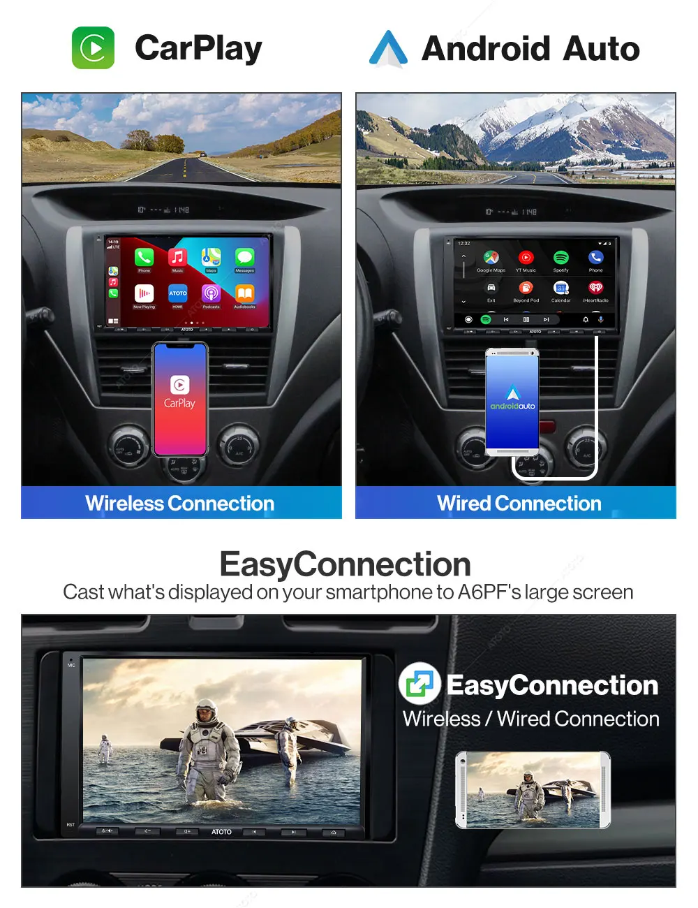 Supports wired (or Wireless) Apple CarPlay, Android Auto, and Mirror Link (EasyConnection App)