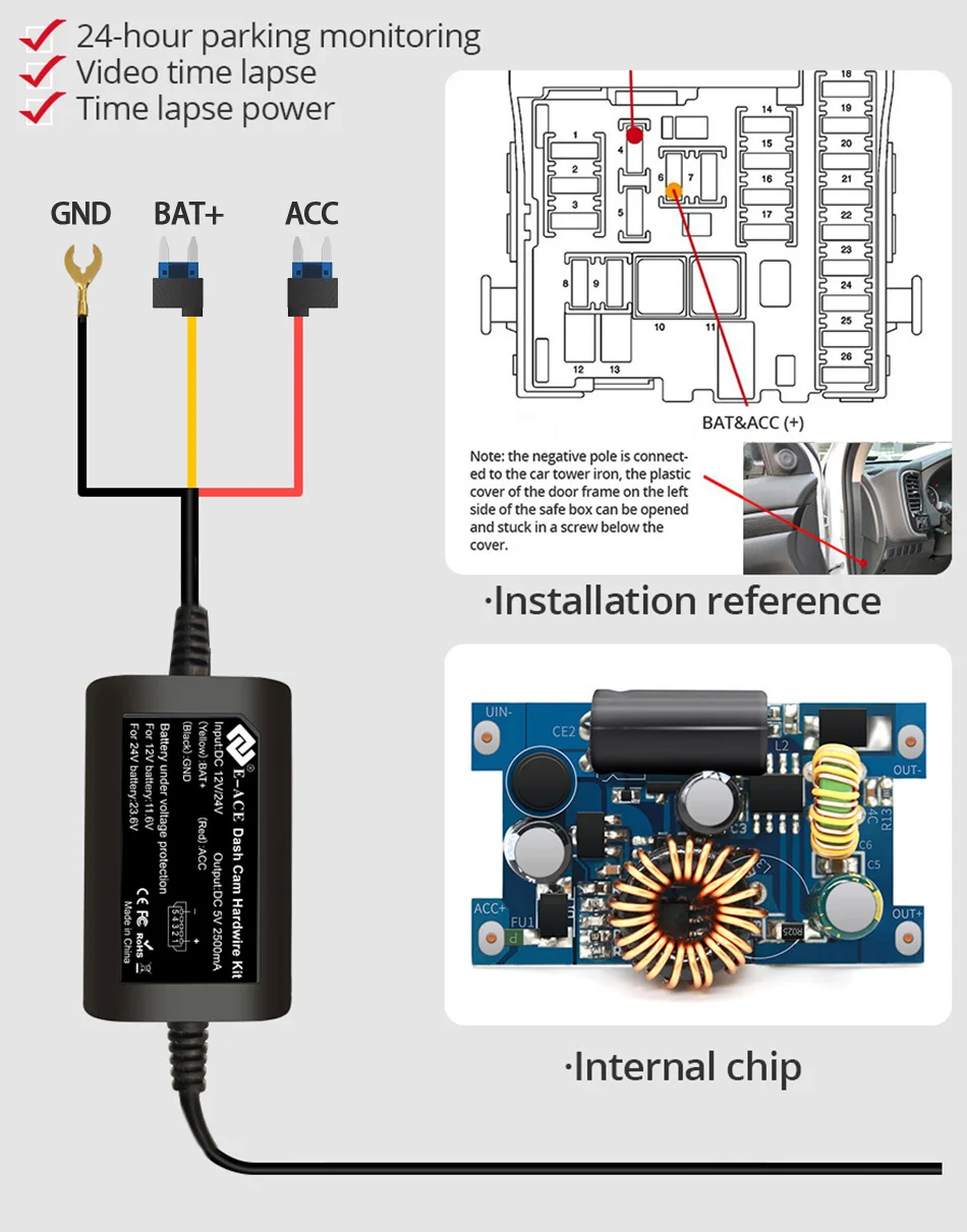 If you want to stop monitoring after parking (the DVR does not work after parking), connect the positive pole of the buck line to the fuse box ACC interface.