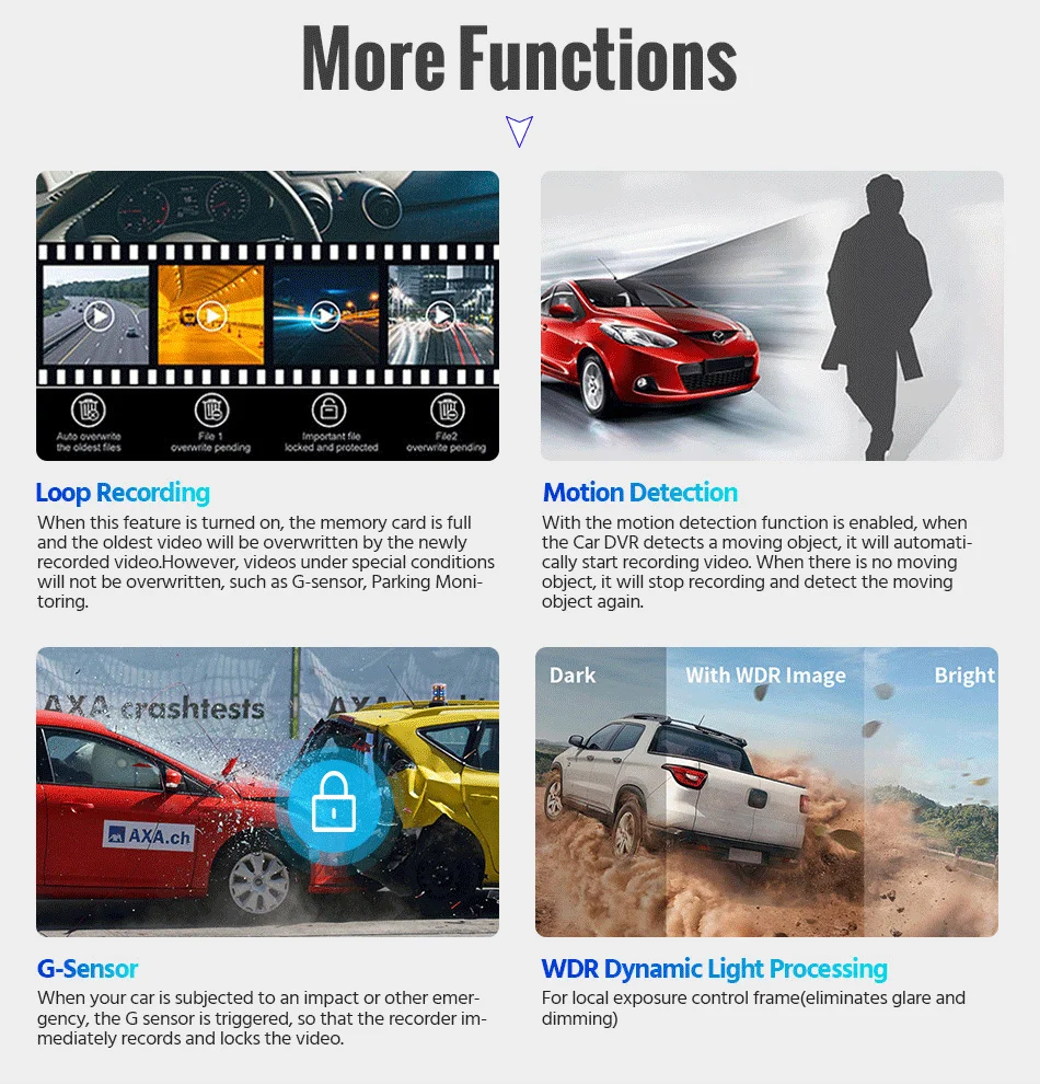 ● Basic Features: G-Sensor, Cycle Recording, Motion Detection, Parking Monitor, Time&Data Display, Wide Dynamic Range, Picture in picture display, ON/OFF Automatically