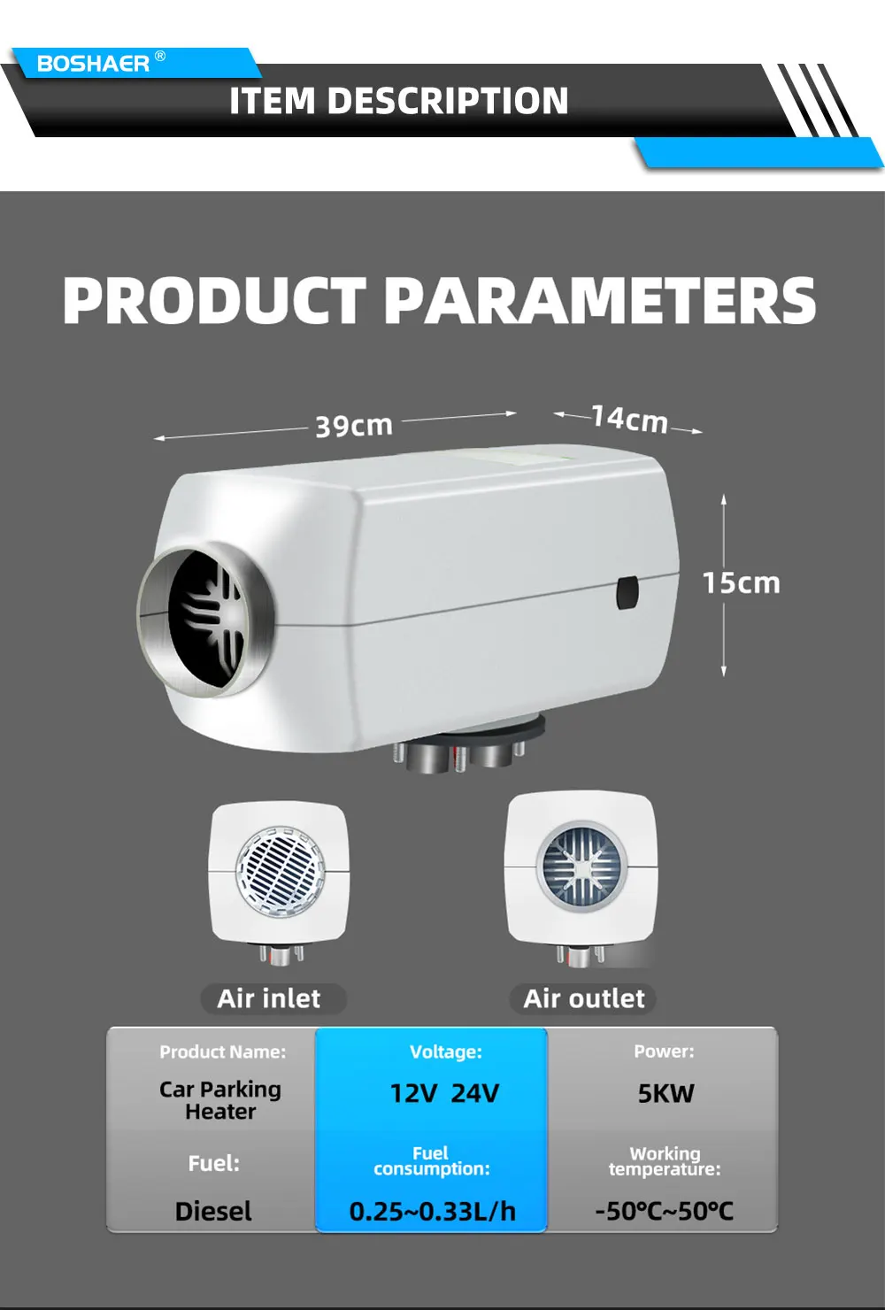 Air Diesel Car Heater 12V 24V 5KW Aluminum Shell Parking Heater For Trucks RV Bus Car Boat Equipped With LCD Key Switch + Remote
