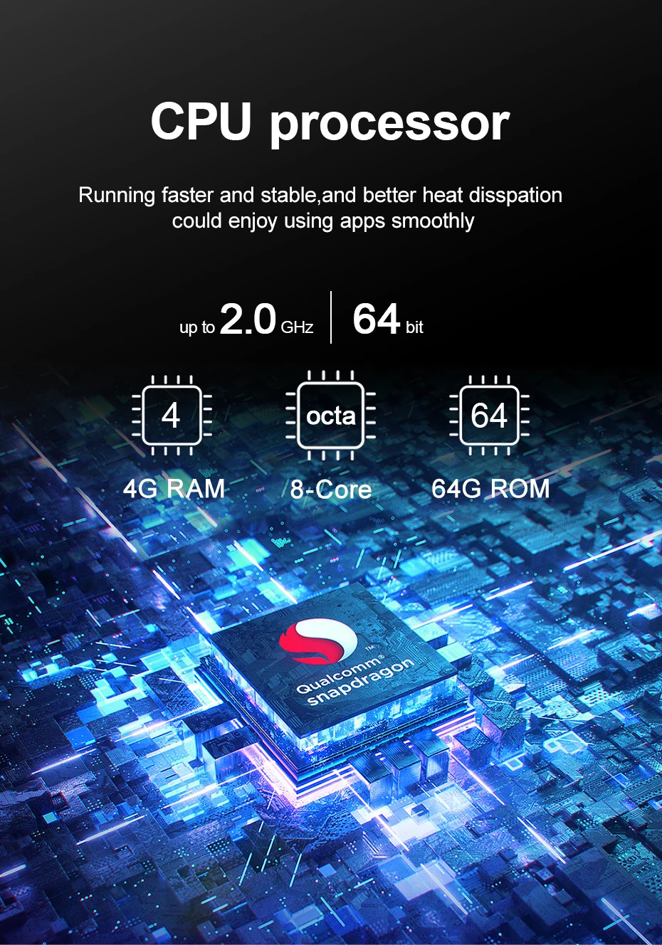 >>>4+64GB the CPU is qualcomn snapdragon processor chip android 10.0. running faster and stable,have better heat dissapation,could enjoy using apps smoothly