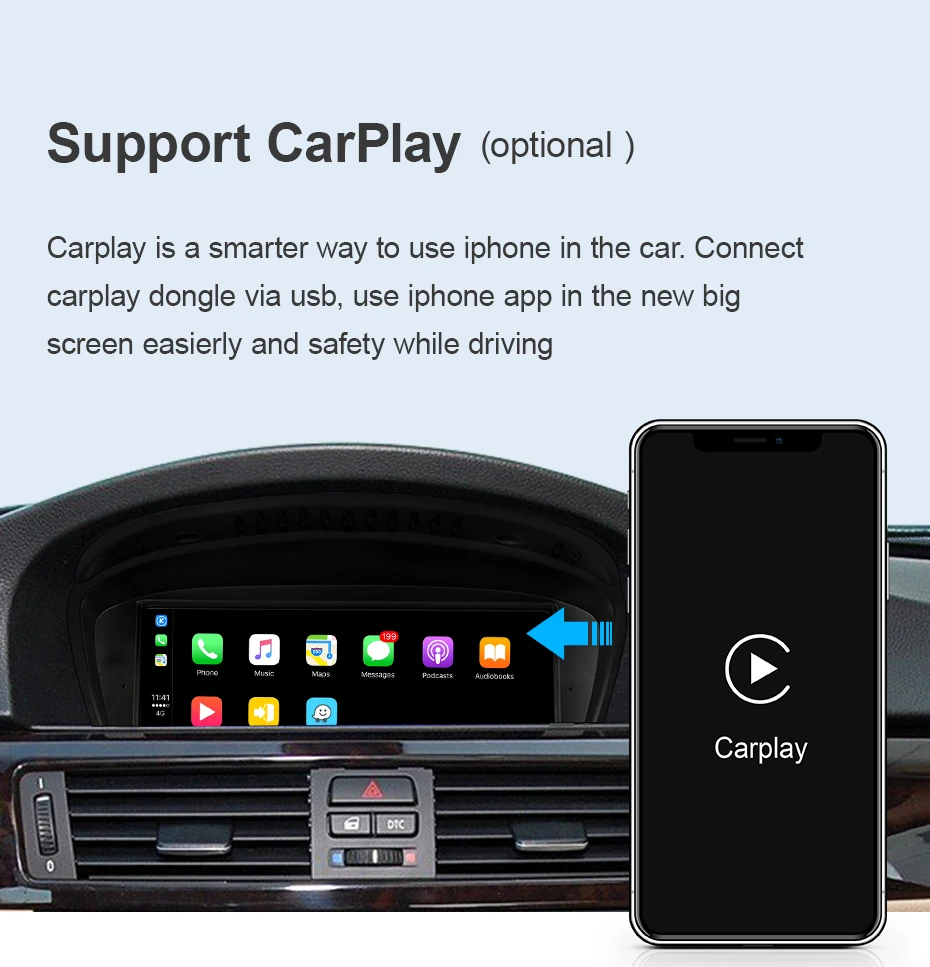 >>>support to connect carplay dongle.but you need to buy carplay dongle in your local market.carplay is smarter way to use iphone in the car.use iphone apps in the new headunit screen easierly and safety while driving.