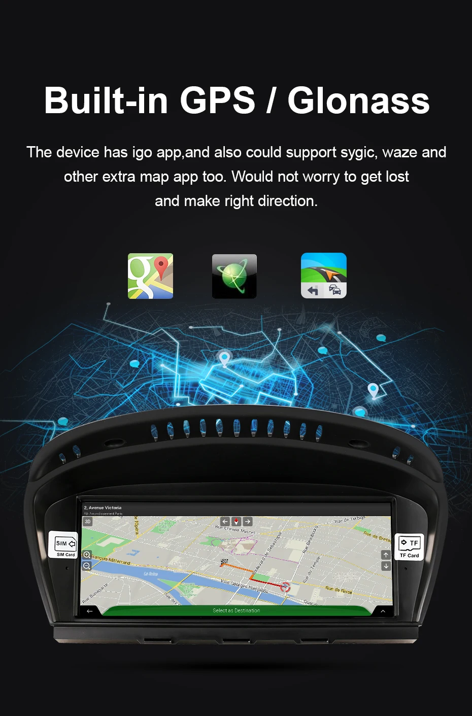 >>>Built-in GPS/Glonass.the device has igo map app,and could suppport sygic ,waze and other extra app too,would not worry about to get lost and make right direction.