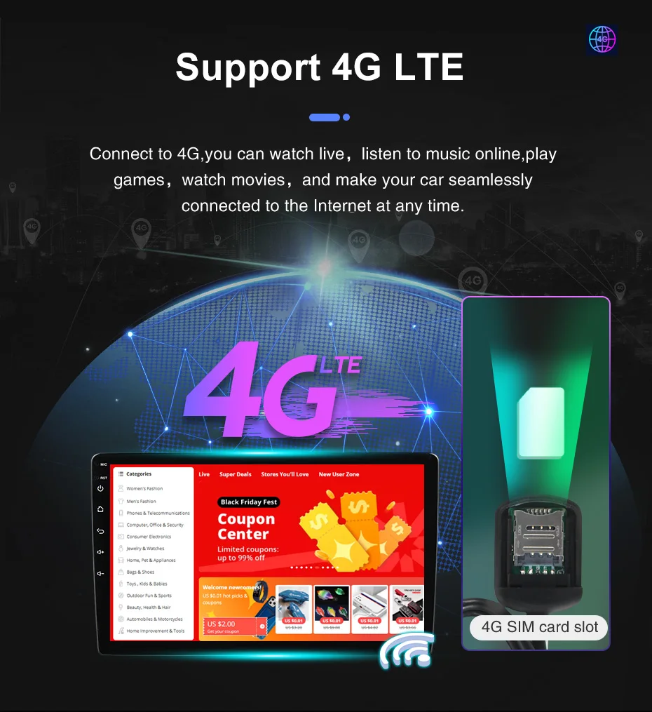 Connect to 4G,you can watch live,listen to music online,play games, watch movies, and make your car seamlessly connected to the Internet at any time.