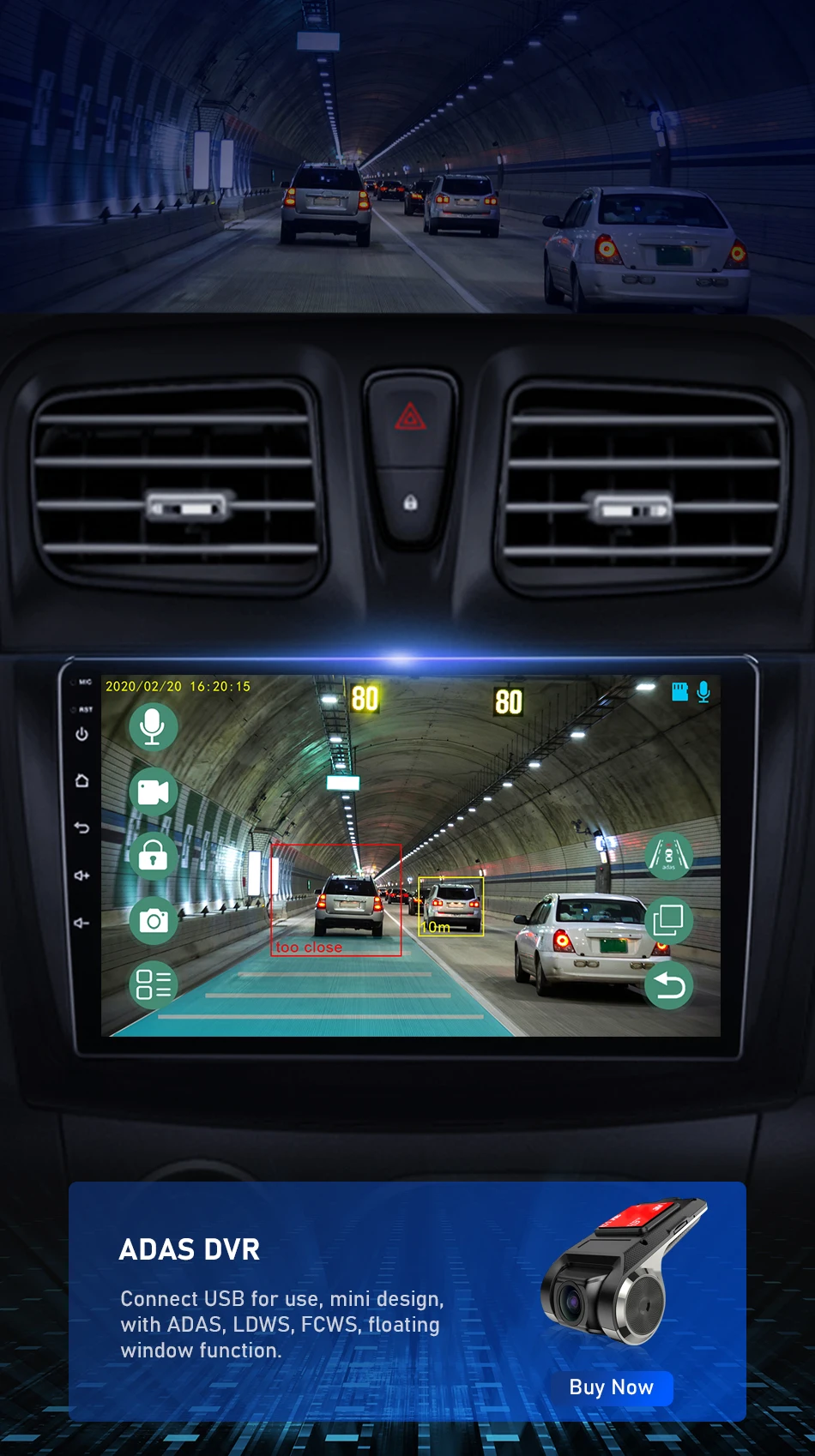 Supports connection to ADAS DVR. ADAS DVR has multiple built-in assistive driving technologies, inserting high-quality TF memory card to record every moment of your driving.